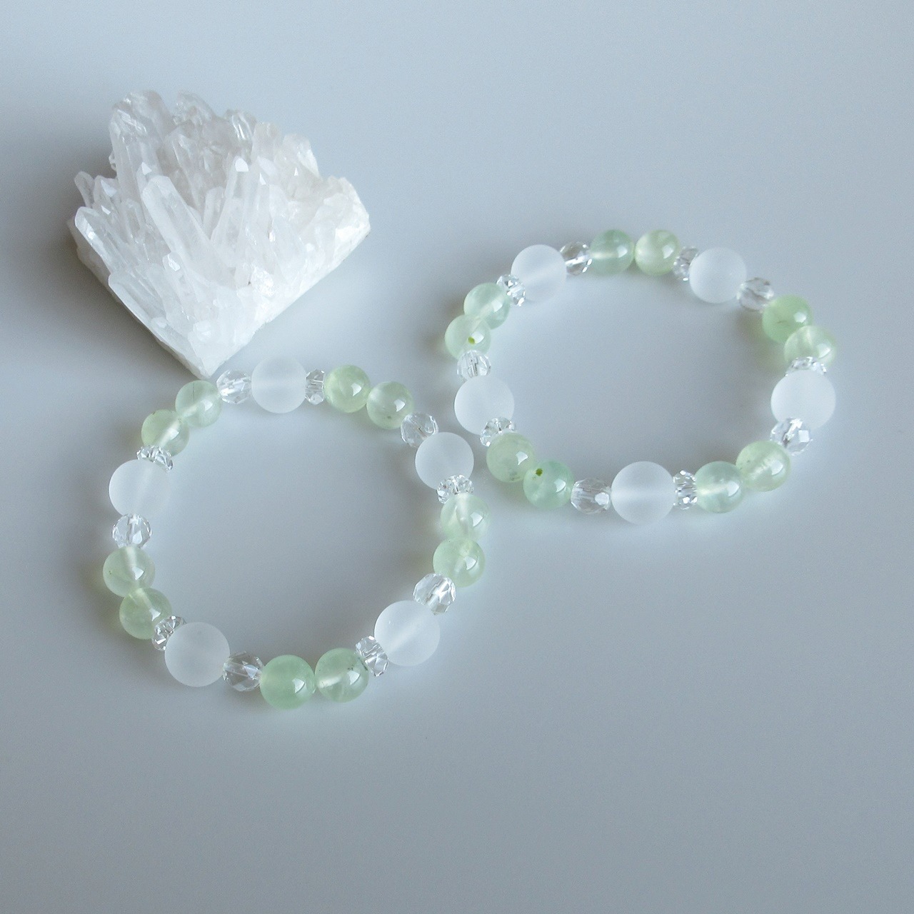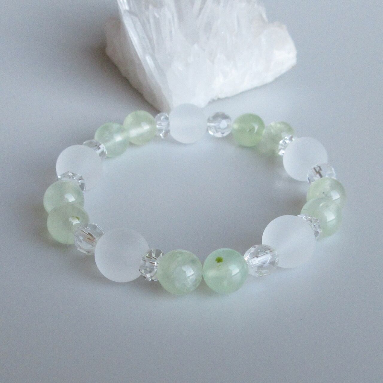 淡い黄緑色が心を癒してくれそうな色合いのプレナイトに、柔らかい白色が上質な感じのフロストクリスタルとボタンカットクリスタル組み合わせたブレスレットです。